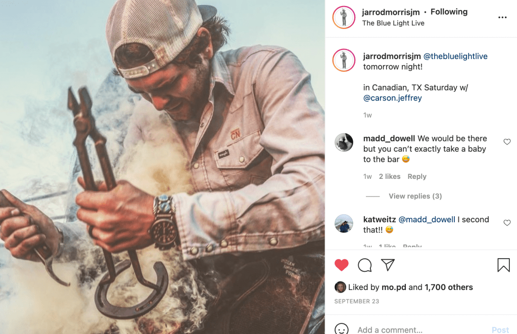Jarrod maintains his own farrier business on top of his music career and calls himself a “horseshoer by day and a singer/songwriter by night,” according to the American Farriers Journal. He loves his blue collar job shoeing horses, it has give him a flexible schedule and the ability to do what he wants with his music. He calls horseshoeing very humbling and sites it as an inspiration for several of his songs, Jarrod plans to keep doing it for as long as he can.