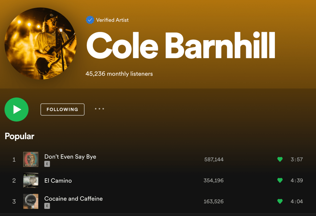 Cole has gained quite a following on Spotify with over 45,000 monthly listeners and each of his top three songs with over 100,000 plays. When considering Cole only has 594 facebook likes, 2,168 Instagram followers, and 230 Twitter followers, this is a massive contrast.